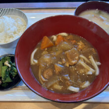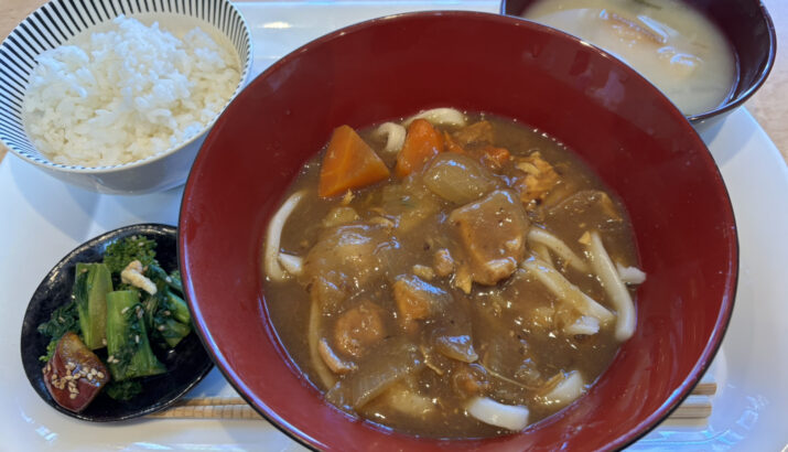 本日2/20(金)のメニューはカレーうどんに白ごはん、味噌汁、野菜のおかずがついた、しっかり食べられる一食!!